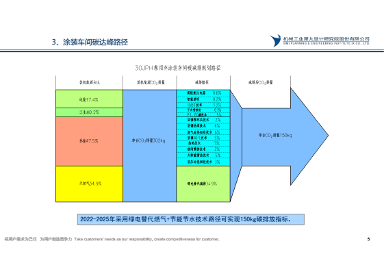 國務院2021年10月24日頒布《2030年前碳達峰行動方案》,到2025年,非化石能源消費比例達到20%左右,單位國內生產總值能源消耗比2020年下降13.5%,單位國內生產總值二氧化碳排放比2020 年下降18%,目前汽車涂裝車間化石能源消費比約占80%,碳排放約占汽車工廠65%,汽車工廠實現碳達峰,涂裝需先行。