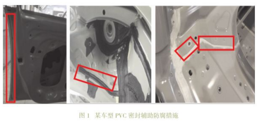 門蓋折邊區域一般采用人工密封,通過工藝槍嘴將密封膠涂覆在折邊處,膠寬根據折邊寬度一般在5 mm左右,膠厚2~3 mm,既美觀有起到密封防腐的作用。某車型PVC密封輔助防腐措施如圖1所示。