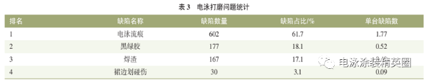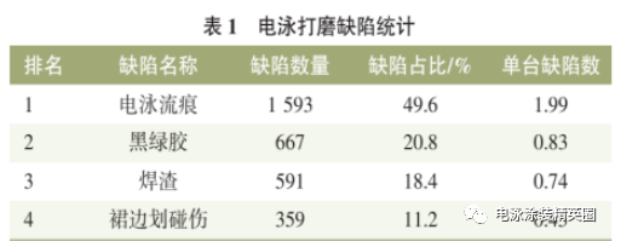 對電泳打磨在線及離線操作處理的缺陷進行分類和統計,從而確定主要質量缺陷及其占比排名,見表1所列。