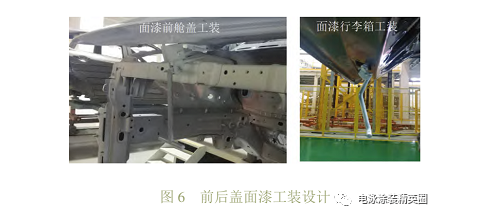 面漆前后蓋工裝安裝設計,我們優先選擇的位置是前蓋鎖扣及后蓋鎖安裝孔,這樣的方式工裝可以選擇防撞梁和前艙蓋鎖扣固定,為方便員工操作固定方式盡量設計簡單方便,見圖6。