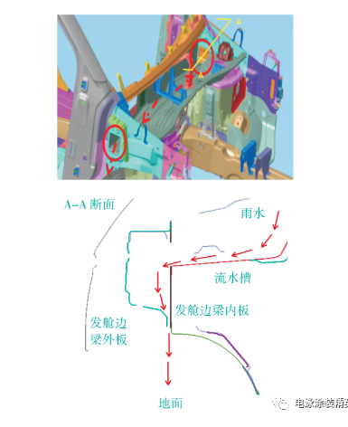 對白車身流水結構進行分析,審查好車身流水線路,確保水流沿著車身流水槽可以直接排到地面,避免水流入到車身內部或內腔。