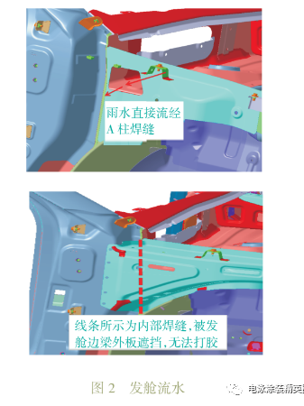 車身防腐結構設計主要包含車身流水結構設計及鈑金搭接設計,車身流水結構設計不佳或者鈑金搭接缺口過大均會導致白車身(焊縫)進水出現銹蝕。