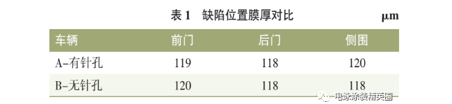 漆膜越厚,溶劑、水分或空氣越不容易揮發,在烘烤受熱過程中越容易頂破漆膜,形成針孔?,F場選擇有針孔缺陷與無針孔缺陷各一臺車輛,且確保同顏色同款車輛,并對缺陷位置膜厚進行測量對比,結果見表 1所列。