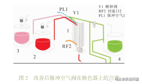 驗證方案:對 PL1 閥門位置結構進行改造,將 PL1閥置于換色器最頂端(如圖 2所示)同時將 RF2 閥置于底端(同時調整控制管路)。持續跟蹤,確認有效,為主要因素。